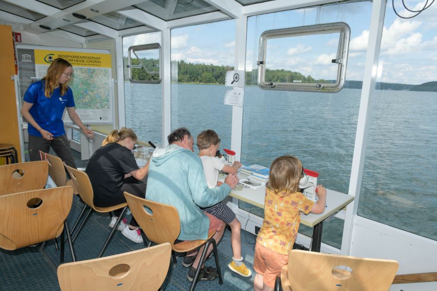 In der einstündigen Schnupperfahrt erleben wir nur einen kleinen Ausschnitt der möglichen Forschungsthemen an Bord. Mit Hilfe eines Krans am Heck könnten wir noch Boden- und Pflanzenproben einholen und analysieren. Vielleicht hätten wir eine der ganz seltenen Armleuchteralgen herausgefischt, die es im Werbellinsee noch gibt. Wir könnten uns die Solartechnik des Schiffs erklären und die Zusammenhänge von Biodiversität und menschlichem Handeln verdeutlichen lassen. „Wir bieten verschiedene Pakete für Kitakinder, Schüler, Studenten und Erwachsene an. Die Fahrten dauern dann 2,5 Stunden.“ Das Projekt „Fische, Fernglas, Fotosynthese“ der „Solar Explorer“ des Biosphärenreservats Schorfheide-Chorin ist so vielfältig und interessant, dass es sogar von einem Gremium der UN-Dekade Biologische Vielfalt ausgezeichnet wurde.