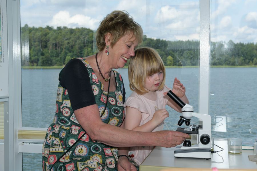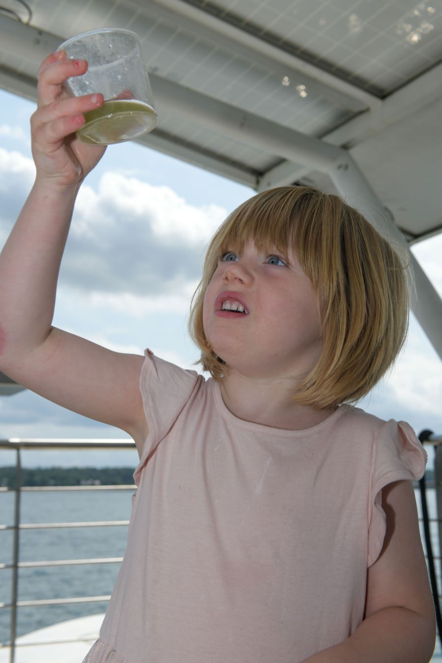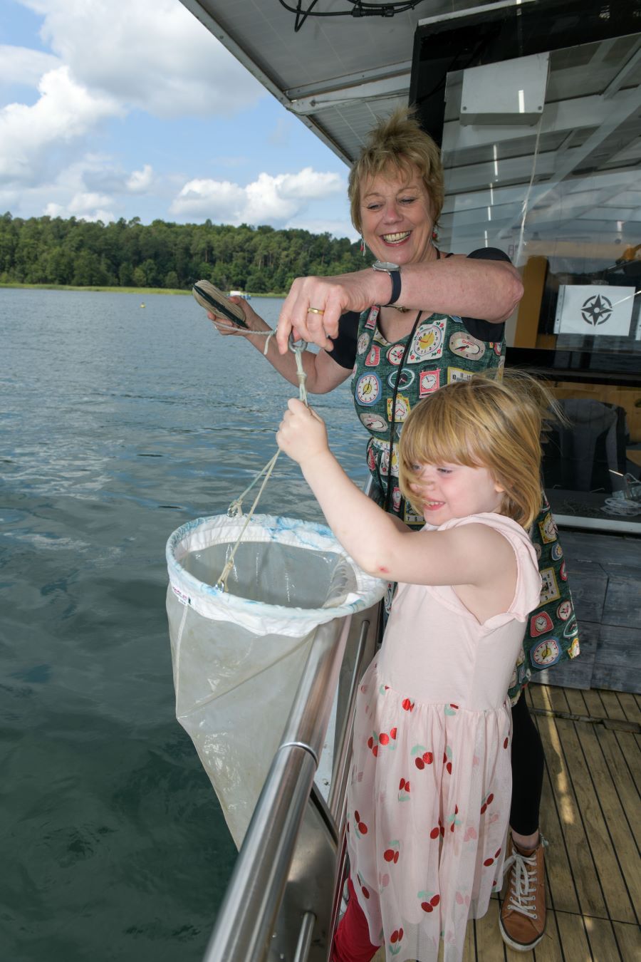 „Da zappelt was“, jubelt die vierjährige Cleo. Neugierig schaut sie noch einmal durch das Mikroskop. Wenig später begutachtet Biologin Anne Wolf den 400-fach vergrößerten Wassertropfen. „Das ist ein Hüpferling“, erklärt sie. Anne Wolf von Kulturlandschaft Uckermark e. V. aus Angermünde leitet an diesem Freitag im August die Mini-Expedition mit dem Forschungsschiff Solar-Explorer.